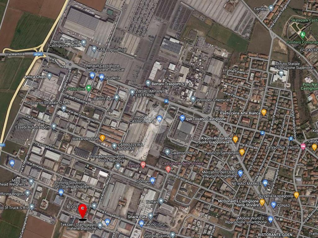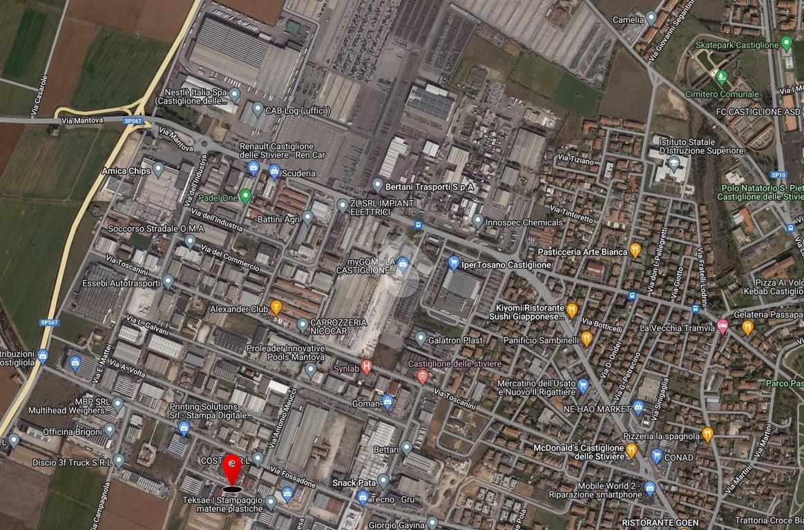 Il capannone facente parte di un insediamento industriale che sorge su un'area di circa 50.000 metri quadrati è ubicato a Castiglione delle Stiviere comodamente raggiungibile dalla strada statale Goitese 236 Mantova-Desenzano.