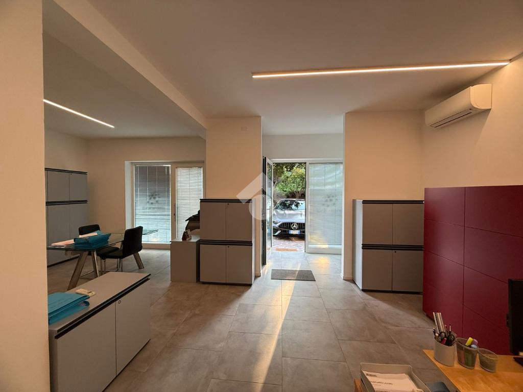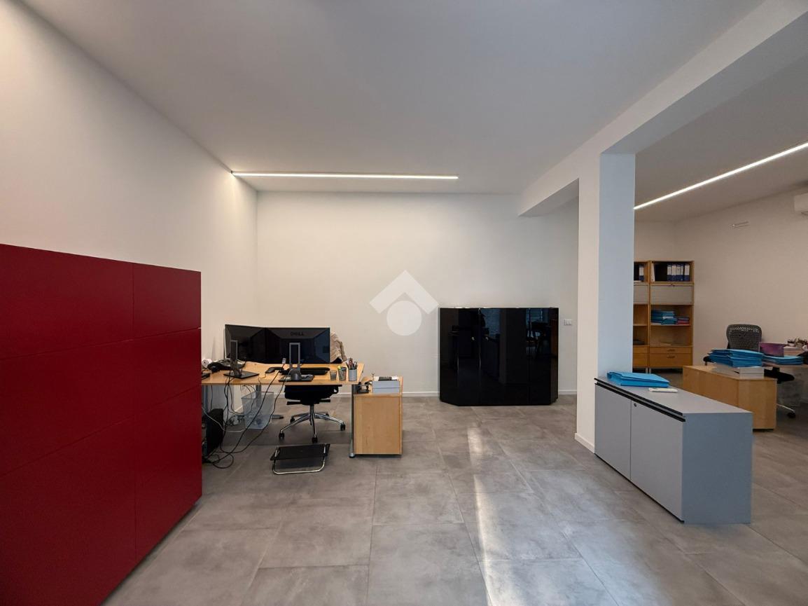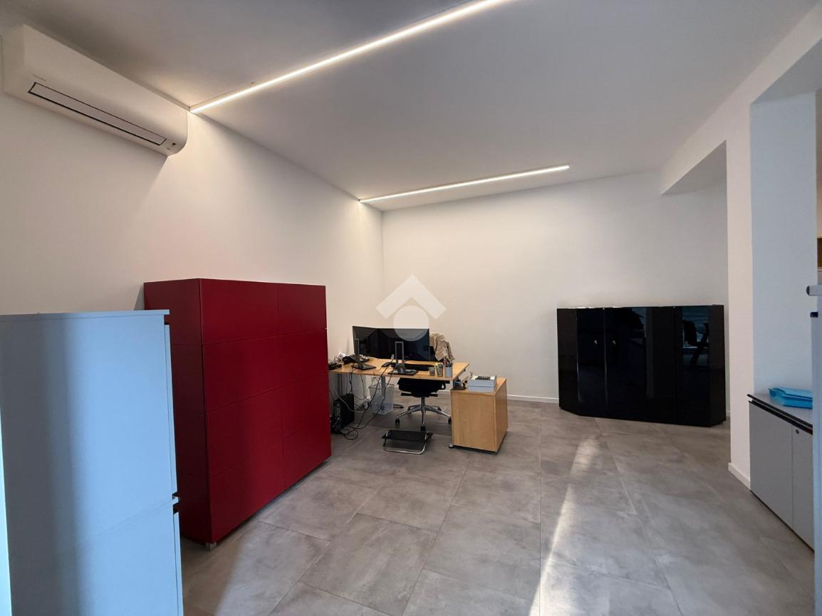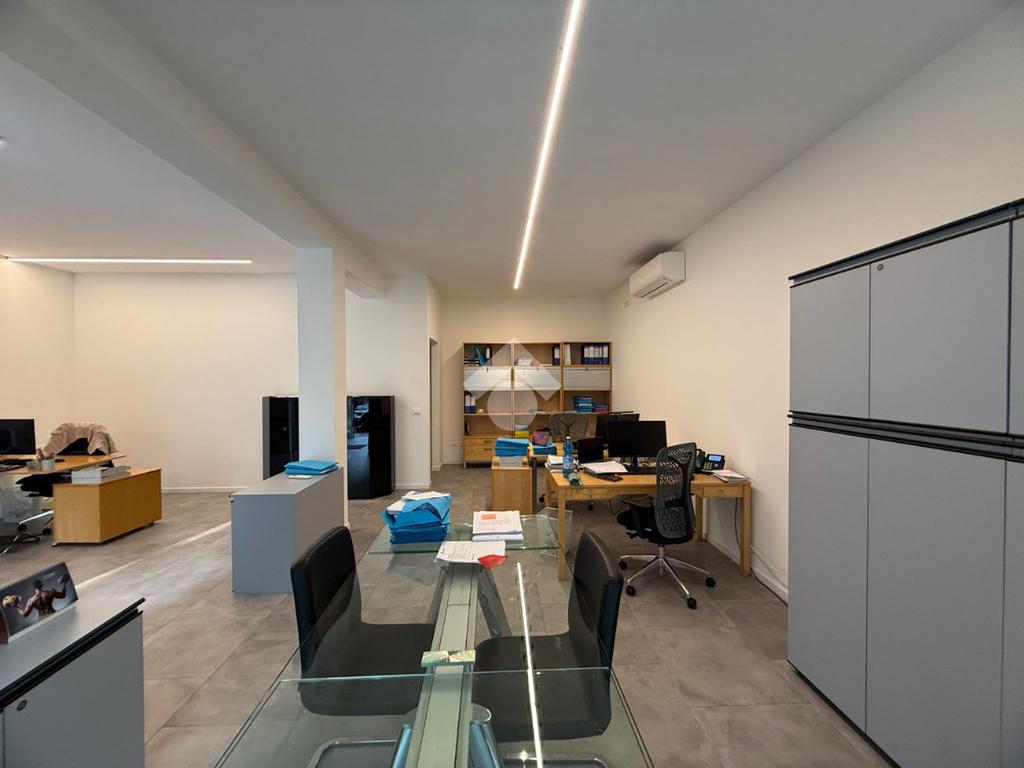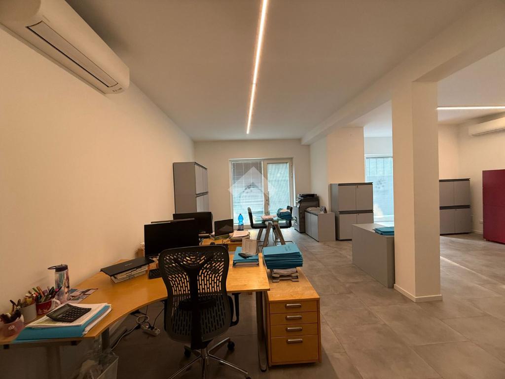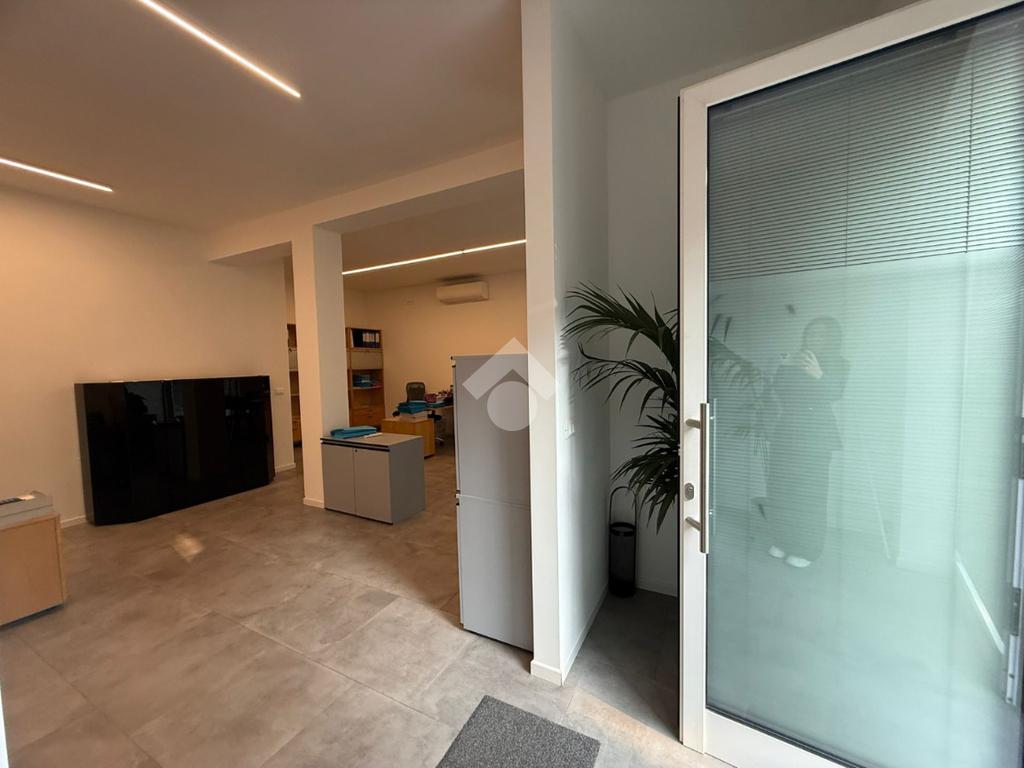 Posto al piano terra di un edificio residenziale, con ingresso indipendente ed esente da spese condominiali, l'immobile si presenta in ottime condizioni con finiture moderne, ideale per studi professionali, attività di consulenza, coworking e uffici di rappresentanza commerciale. Internamente, l’immobile si distingue per la sua organizzazione funzionale e gli ambienti curati nei dettagli. All’ingresso troviamo un ampio open space, valorizzato da due grandi porte-finestre frontali che donano abbondante luce naturale e consentono l’accesso diretto all’esterno, successivamente vi è una sala riunioni e un ripostiglio/archivio. Il bagno finestrato, dotato di sanitari moderni, completa la disposizione interna. La superficie complessiva è di circa 93 metri quadrati, rifinita con pavimenti in gres porcellanato effetto pietra, illuminazione LED a incasso, impianto di climatizzazione caldo/freddo autonomo e infissi con doppi vetri e serramenti di sicurezza. L’ingresso indipendente e l’assenza di barriere architettoniche garantiscono massima comodità e accessibilità. All’esterno, un piazzale privato pavimentato offre 3 posti auto riservati proprio davanti all’ingresso, mentre la facciata moderna e ben visibile dalla strada, arricchita da ampie vetrate personalizzabili con il logo aziendale, assicura un’eccellente visibilità e rappresentanza.