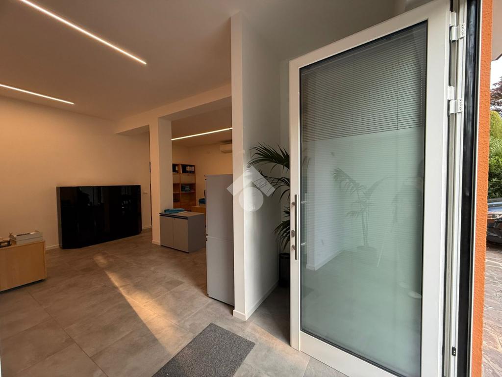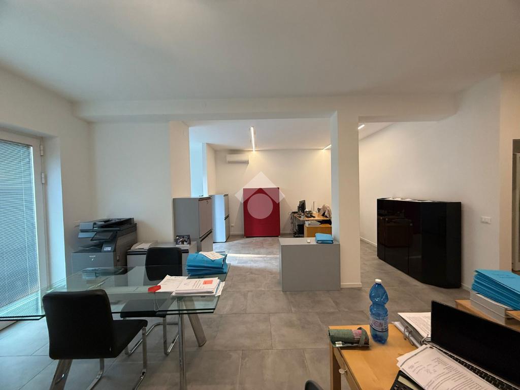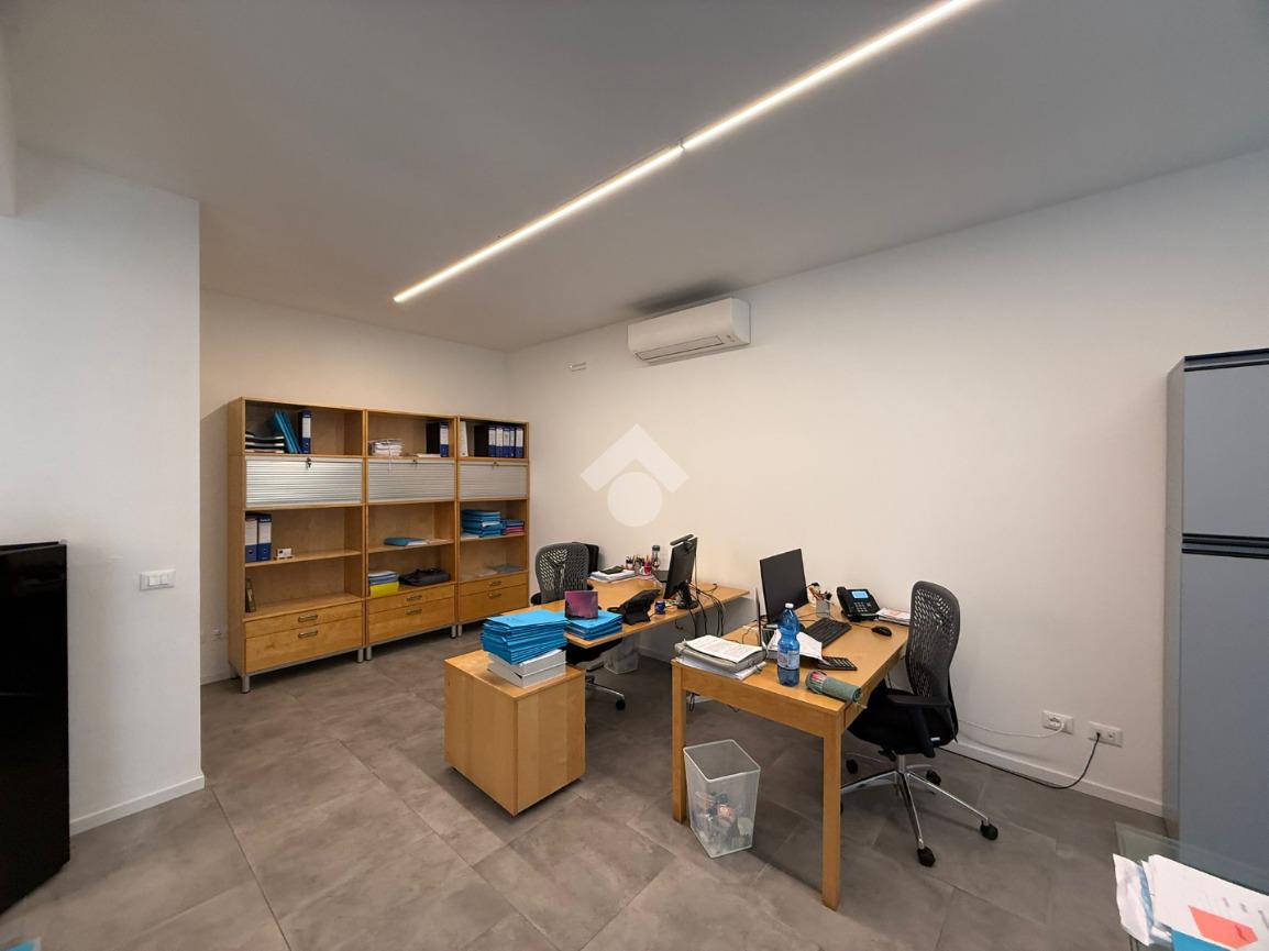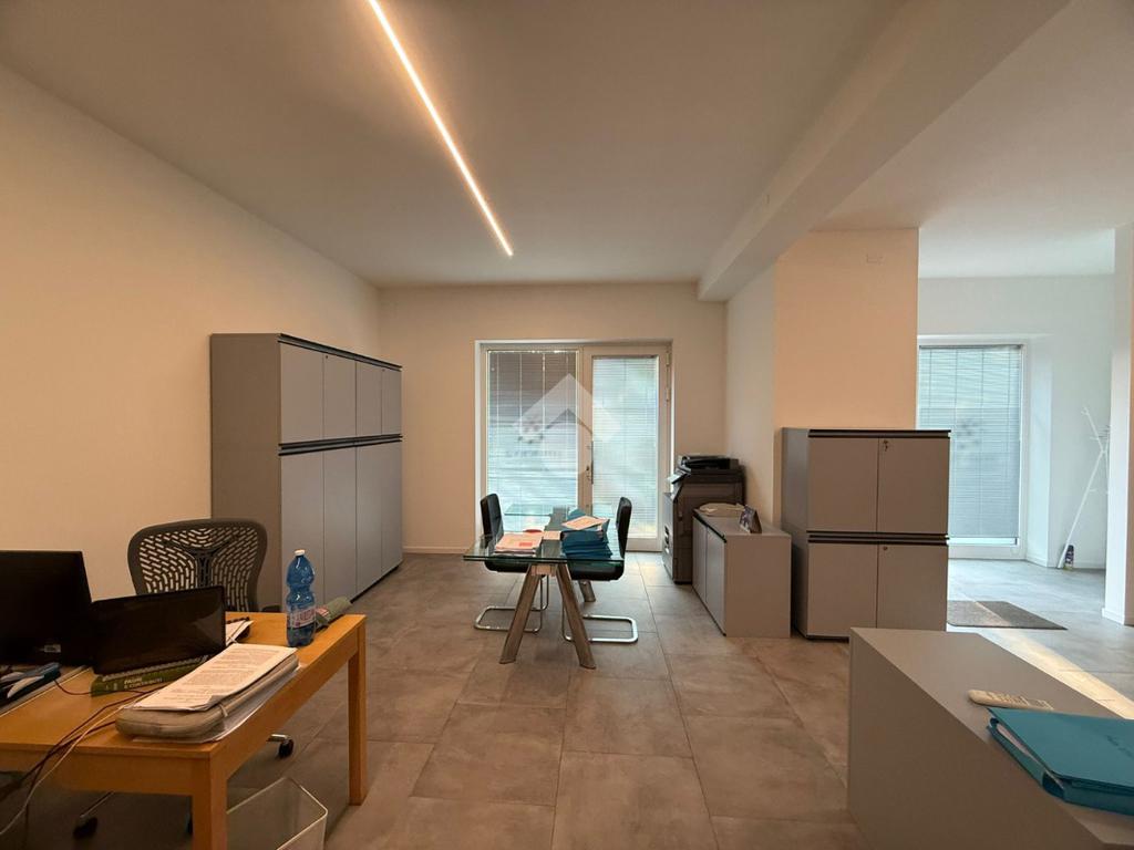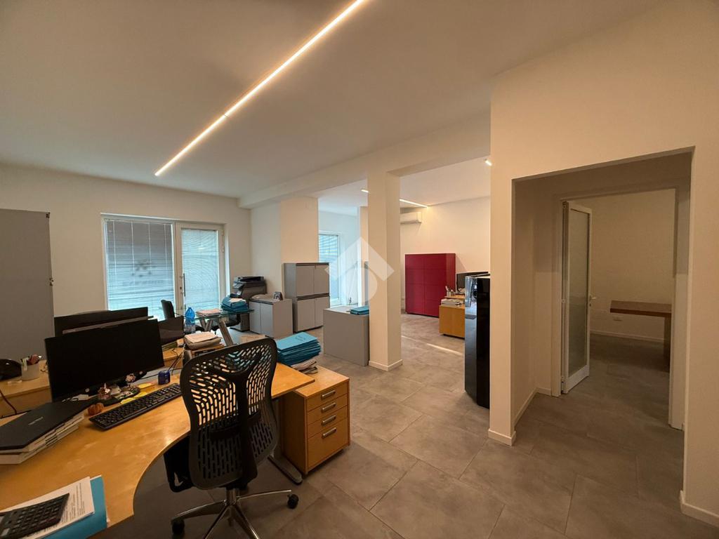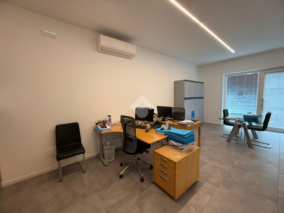 Posto al piano terra di un edificio residenziale, con ingresso indipendente ed esente da spese condominiali, l'immobile si presenta in ottime condizioni con finiture moderne, ideale per studi professionali, attività di consulenza, coworking e uffici di rappresentanza commerciale. Internamente, l’immobile si distingue per la sua organizzazione funzionale e gli ambienti curati nei dettagli. All’ingresso troviamo un ampio open space, valorizzato da due grandi porte-finestre frontali che donano abbondante luce naturale e consentono l’accesso diretto all’esterno, successivamente vi è una sala riunioni e un ripostiglio/archivio. Il bagno finestrato, dotato di sanitari moderni, completa la disposizione interna. La superficie complessiva è di circa 93 metri quadrati, rifinita con pavimenti in gres porcellanato effetto pietra, illuminazione LED a incasso, impianto di climatizzazione caldo/freddo autonomo e infissi con doppi vetri e serramenti di sicurezza. L’ingresso indipendente e l’assenza di barriere architettoniche garantiscono massima comodità e accessibilità. All’esterno, un piazzale privato pavimentato offre 3 posti auto riservati proprio davanti all’ingresso, mentre la facciata moderna e ben visibile dalla strada, arricchita da ampie vetrate personalizzabili con il logo aziendale, assicura un’eccellente visibilità e rappresentanza.